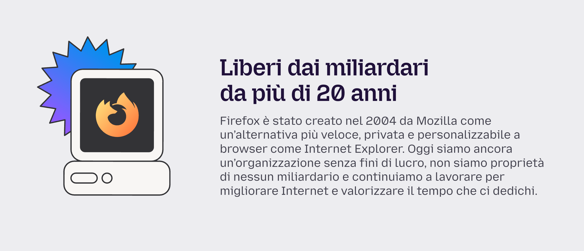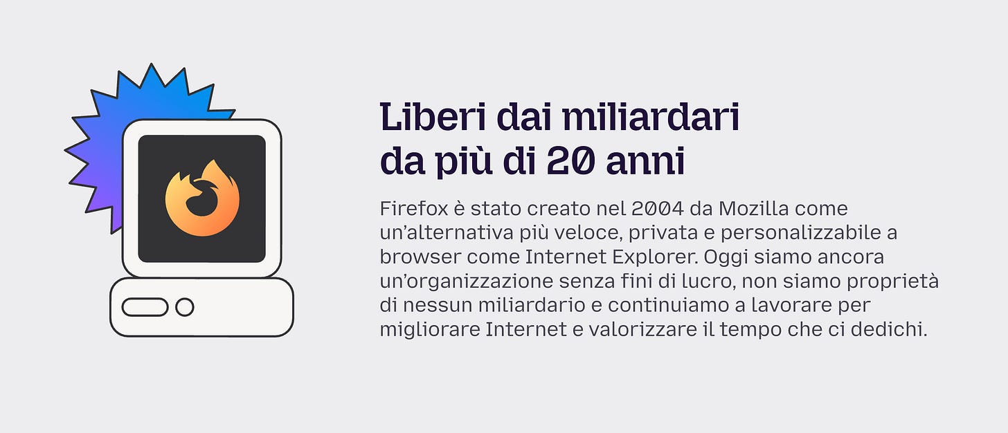 Stavo navigando sul sito di Firefox qualche ora fa, per controllare le release notes di un aggiornamento, quando mi sono imbattuto in un banner che mi ha fatto sorridere. Uno di quei sorrisi un po’ amari, tipo quando scopri che il tuo ristorante vegano preferito è di proprietà di una catena di fast food.