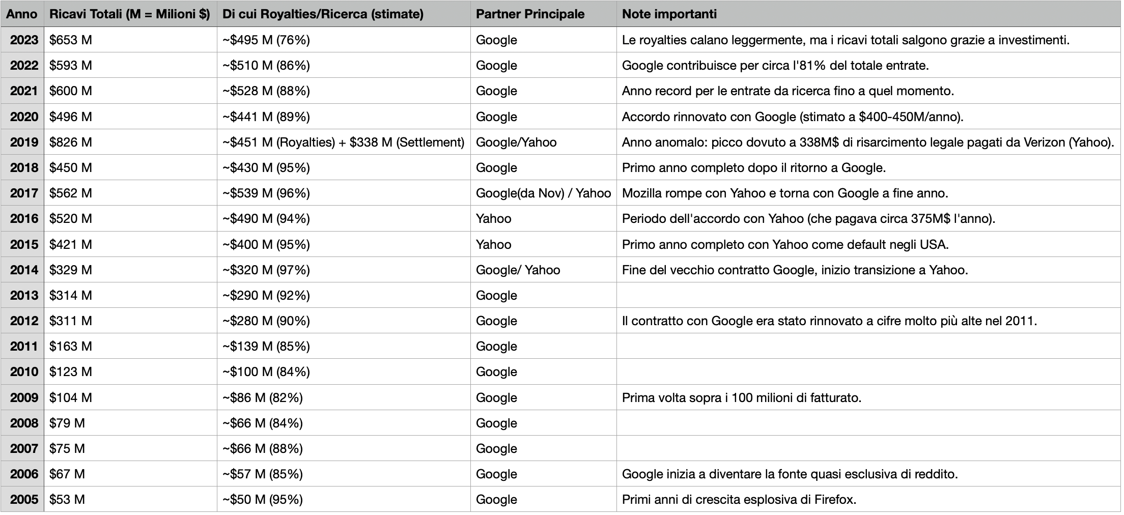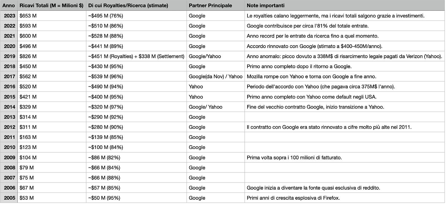 Se guardiamo l’andamento storico, la dipendenza è impressionante. Nel 2005, quando Firefox era nel pieno della sua crescita esplosiva, le royalties da Google rappresentavano già il 95% delle entrate. Nel 2012, dopo il rinnovo del contratto, si parlava di cifre molto più alte. Nel 2020, l’accordo è stato rinnovato con stime tra i 400 e 450 milioni di dollari annui.